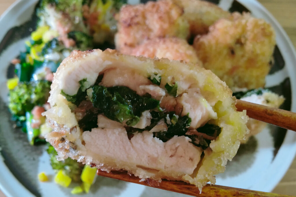 - ①の具材を鶏肉にのせて挟み巻き、6等分ほどの食べやすい大きさに切る。