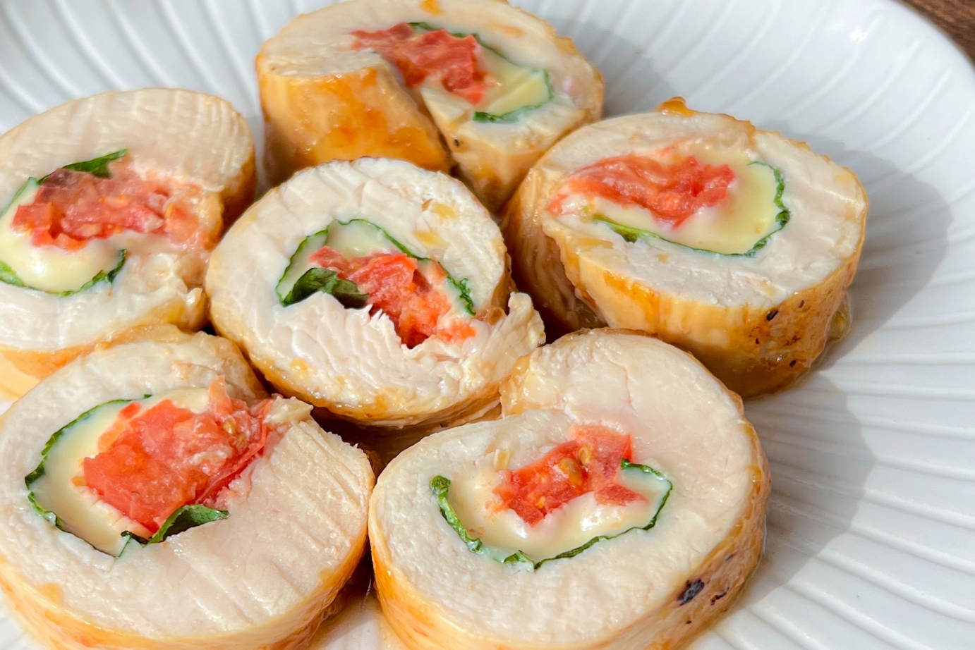 - ①の具材を鶏肉にのせて挟み巻き、6等分ほどの食べやすい大きさに切る。