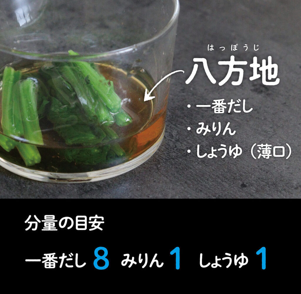 青菜は茹でた後、熱と水分をしっかり取り、八方地に漬け込むと余分な水分が出ずに、素材と和え衣(あえごろも)の味がはっきりと楽しめます。