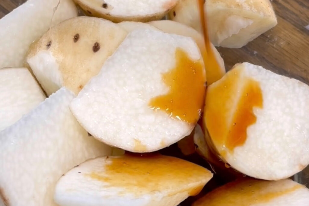 1. 長芋は洗った後、皮ごとひと口大の乱切りにする。
