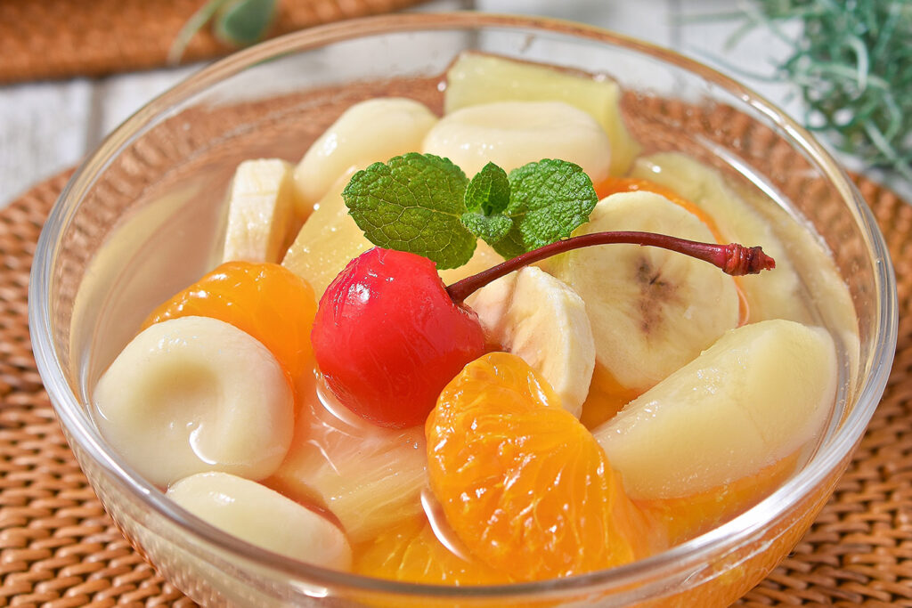 白玉団子のもちもち食感と、色とりどりのフルーツが楽しめるさわやかなデザートです。